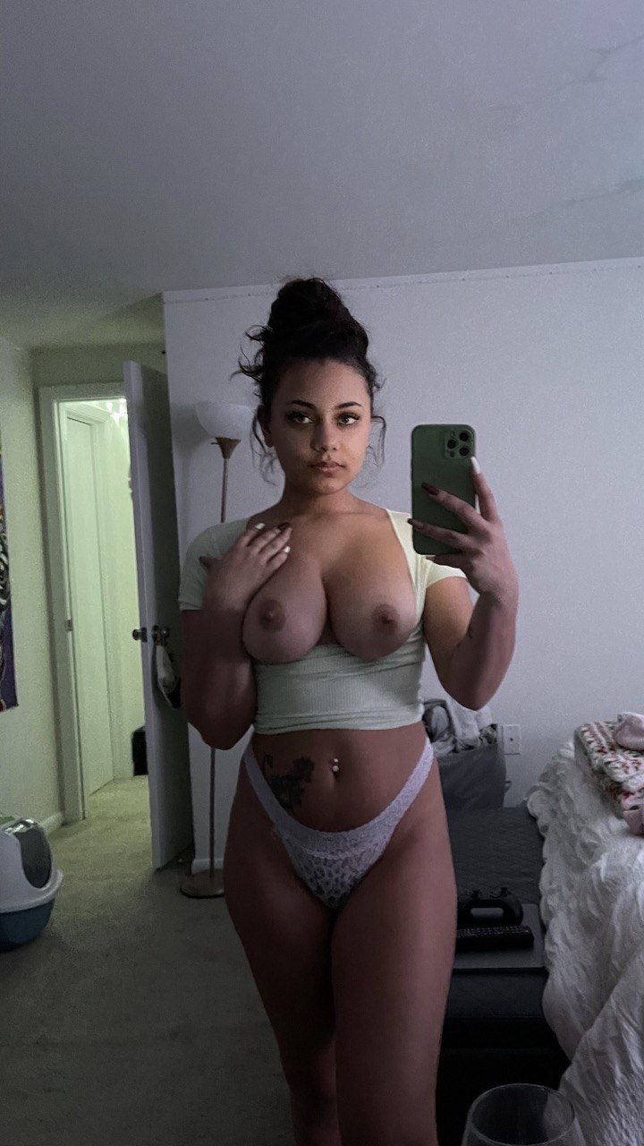 Девушка с удовольствием позирует в лёгкой майке на голое тело