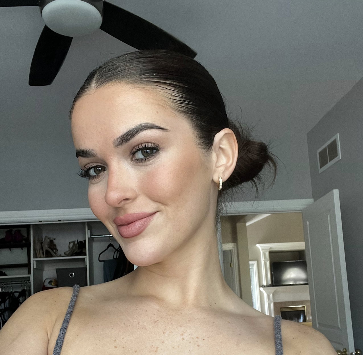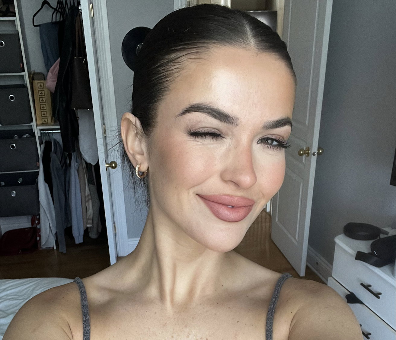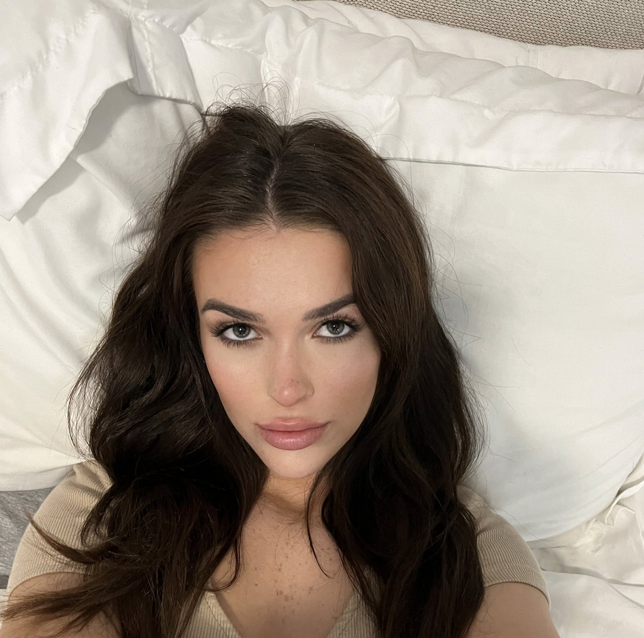 Девушка с удовольствием позирует в лёгкой майке на голое тело