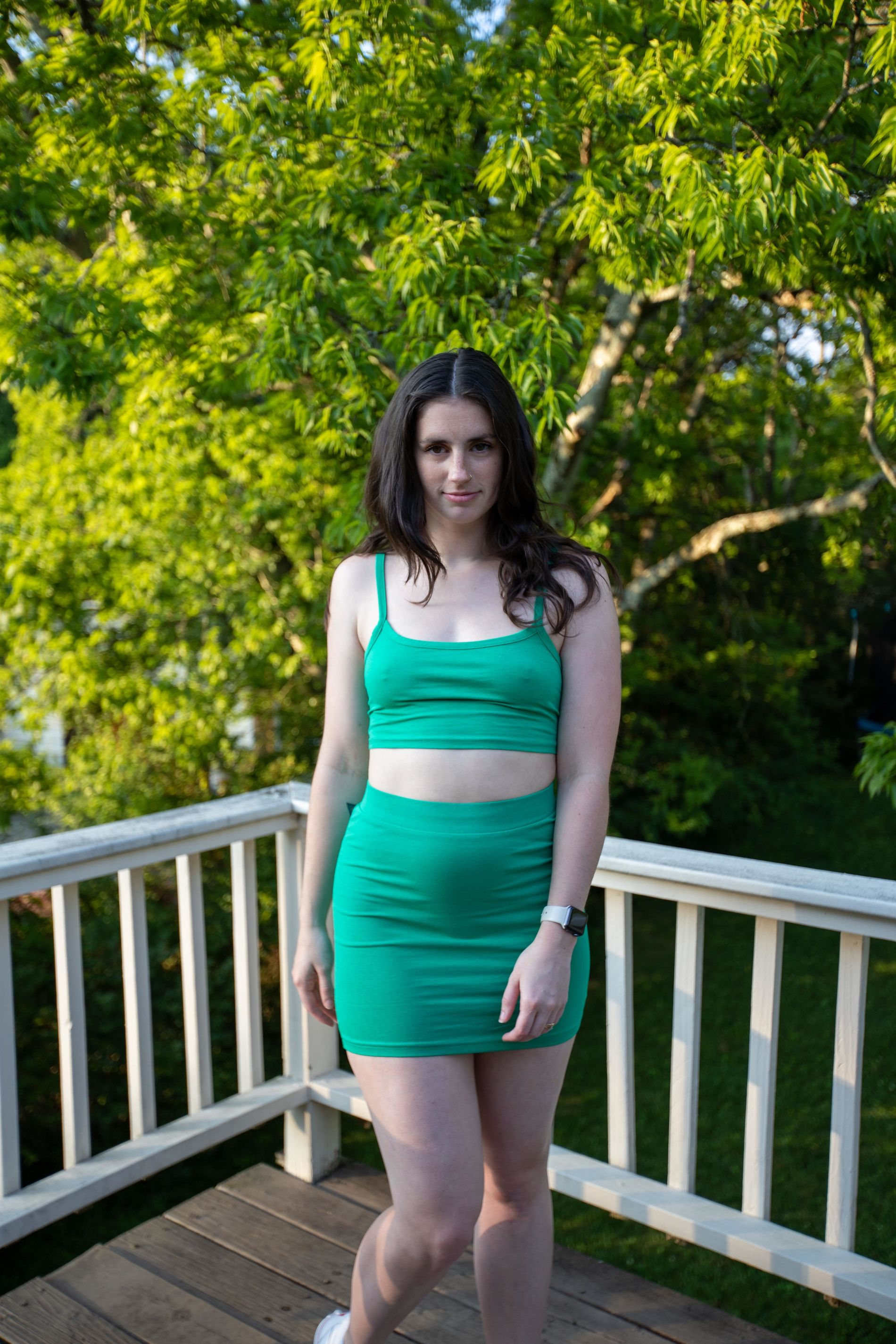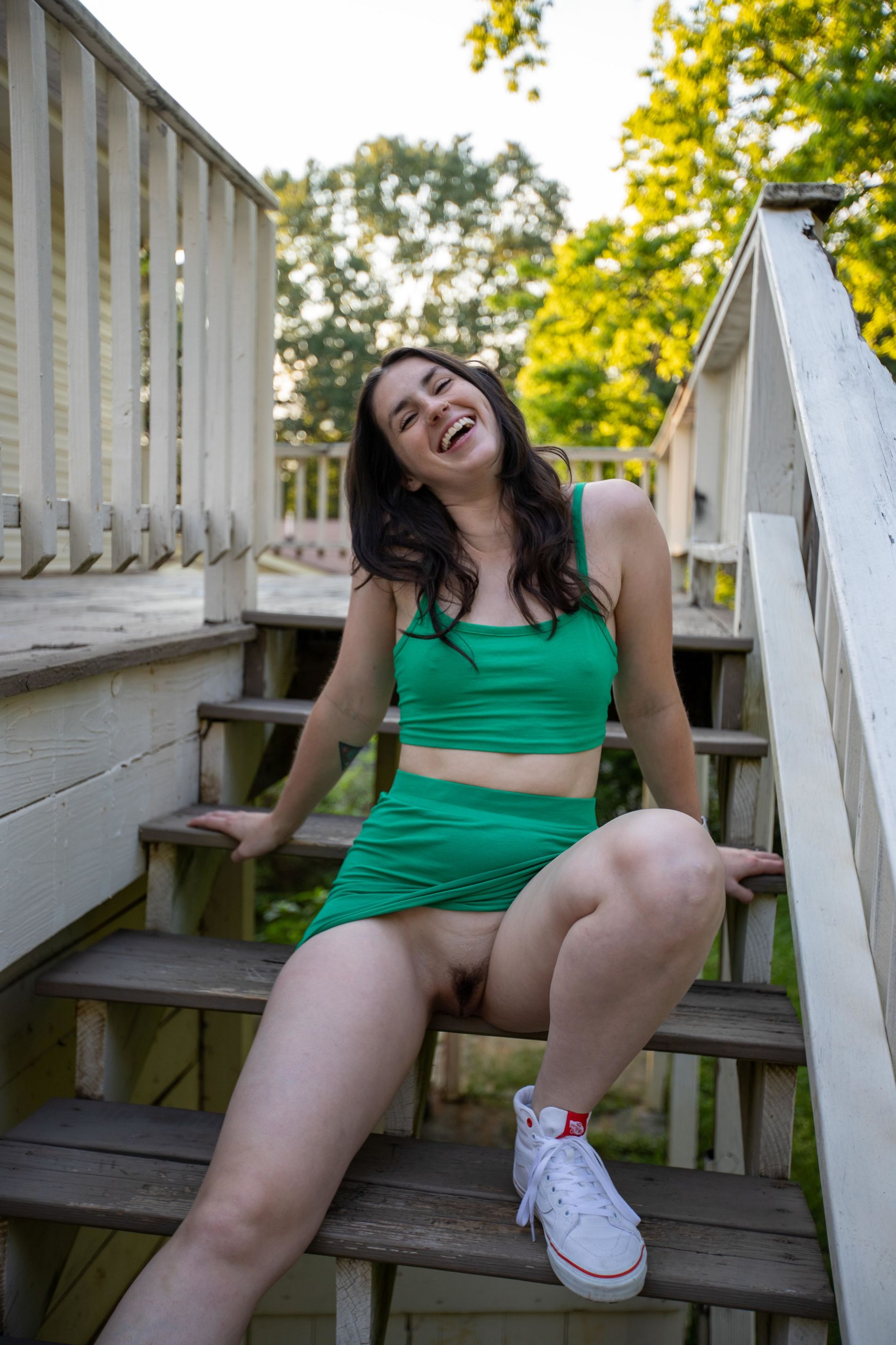 Девушка с удовольствием позирует в лёгкой майке на голое тело