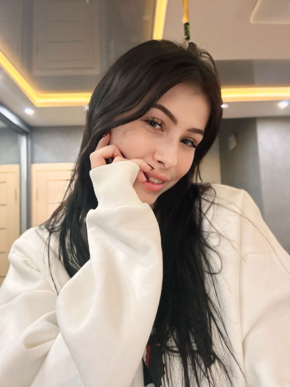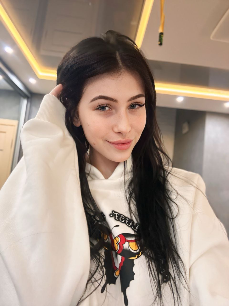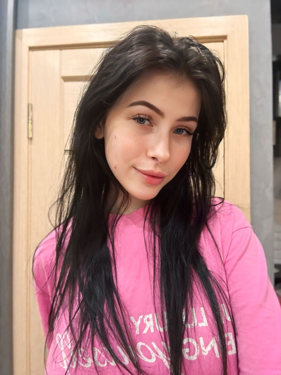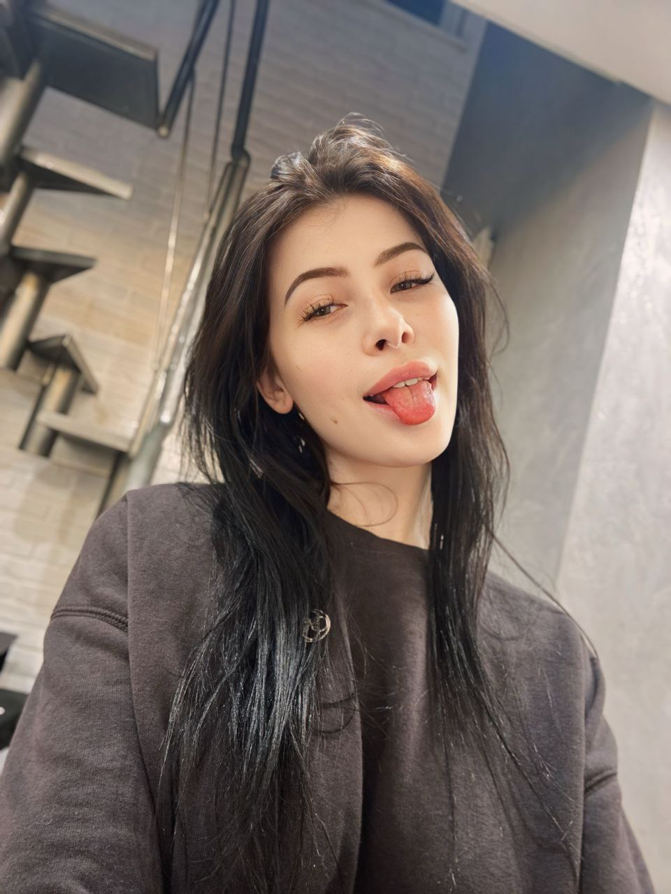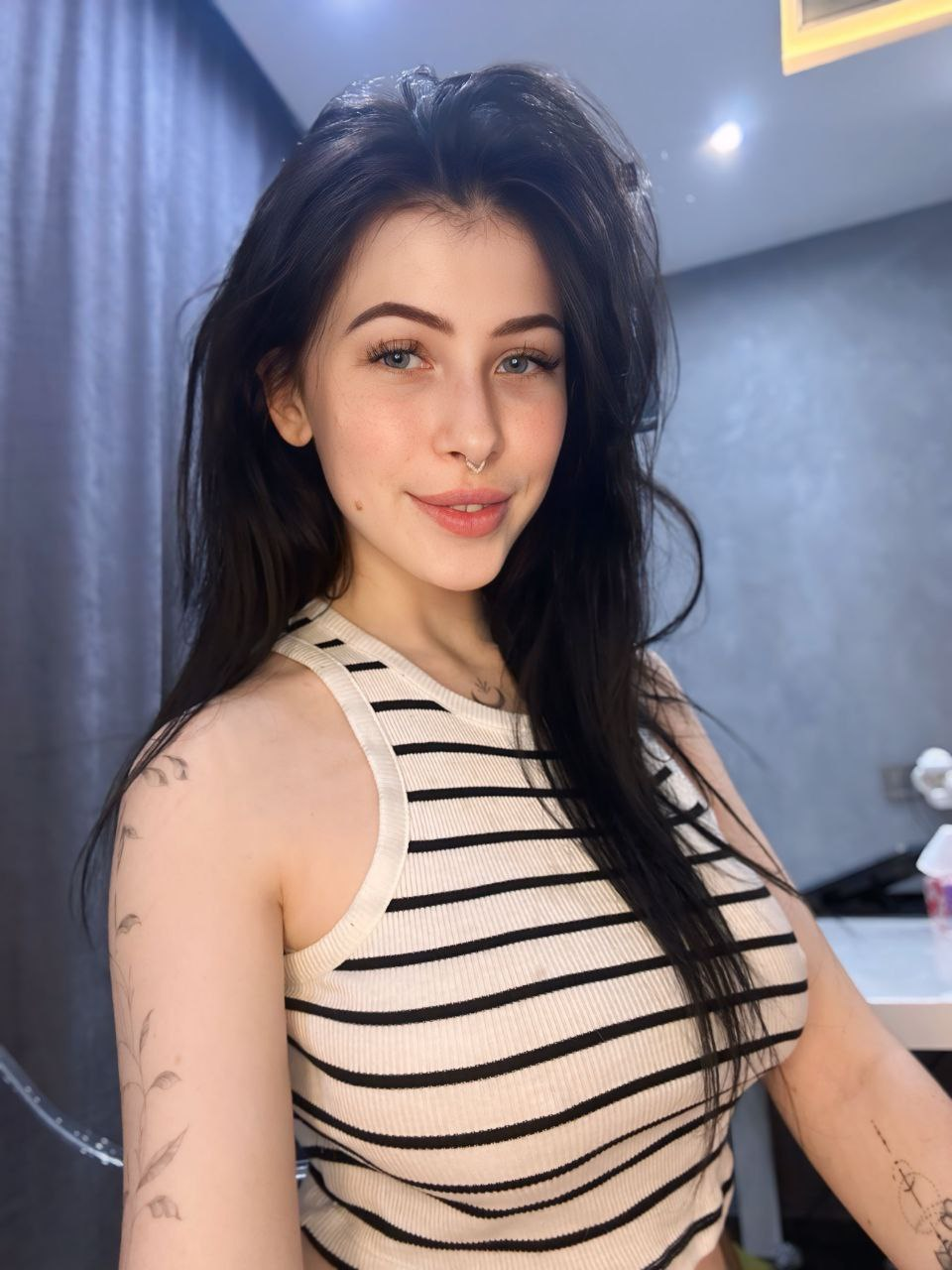 Смотришь, как она стягивает корсет в викторианском стиле — и понимаешь, что это не обычная съёмка. Чёрные волосы рассыпаны по плечам, на коже россыпь татуировок: цветы на бедре, что-то геометрическое на рёбрах. Снято на телефон, но кадры получились чёткие и очень личные. Она позирует у кирпичной стены, сначала в юбке с шестерёнками и чулках, потом постепенно раздевается, показывает грудь, поворачивается спиной. Финальный кадр — голая, стоит в три четверти, пальцы слегка касаются татуировки на бедре.