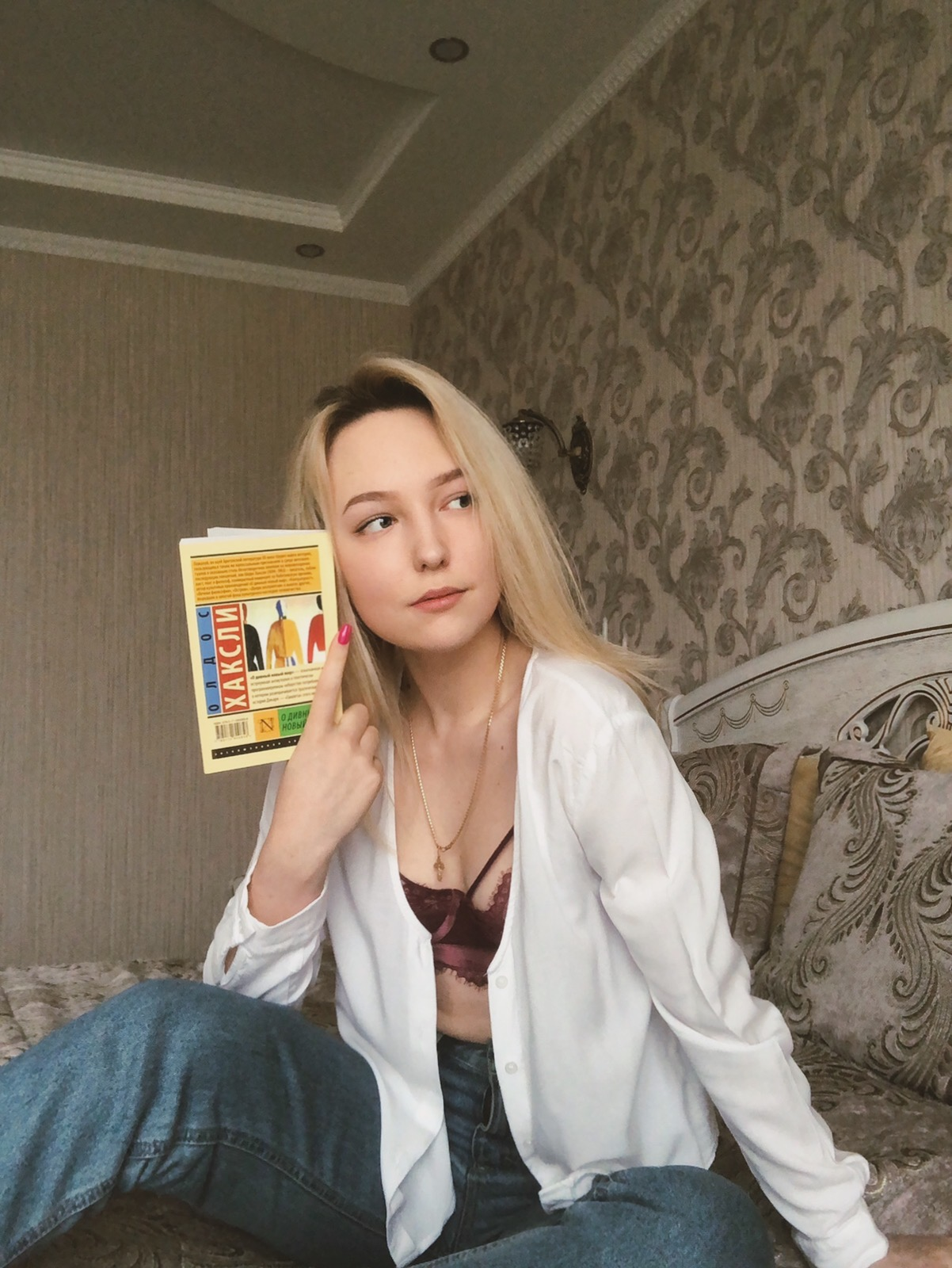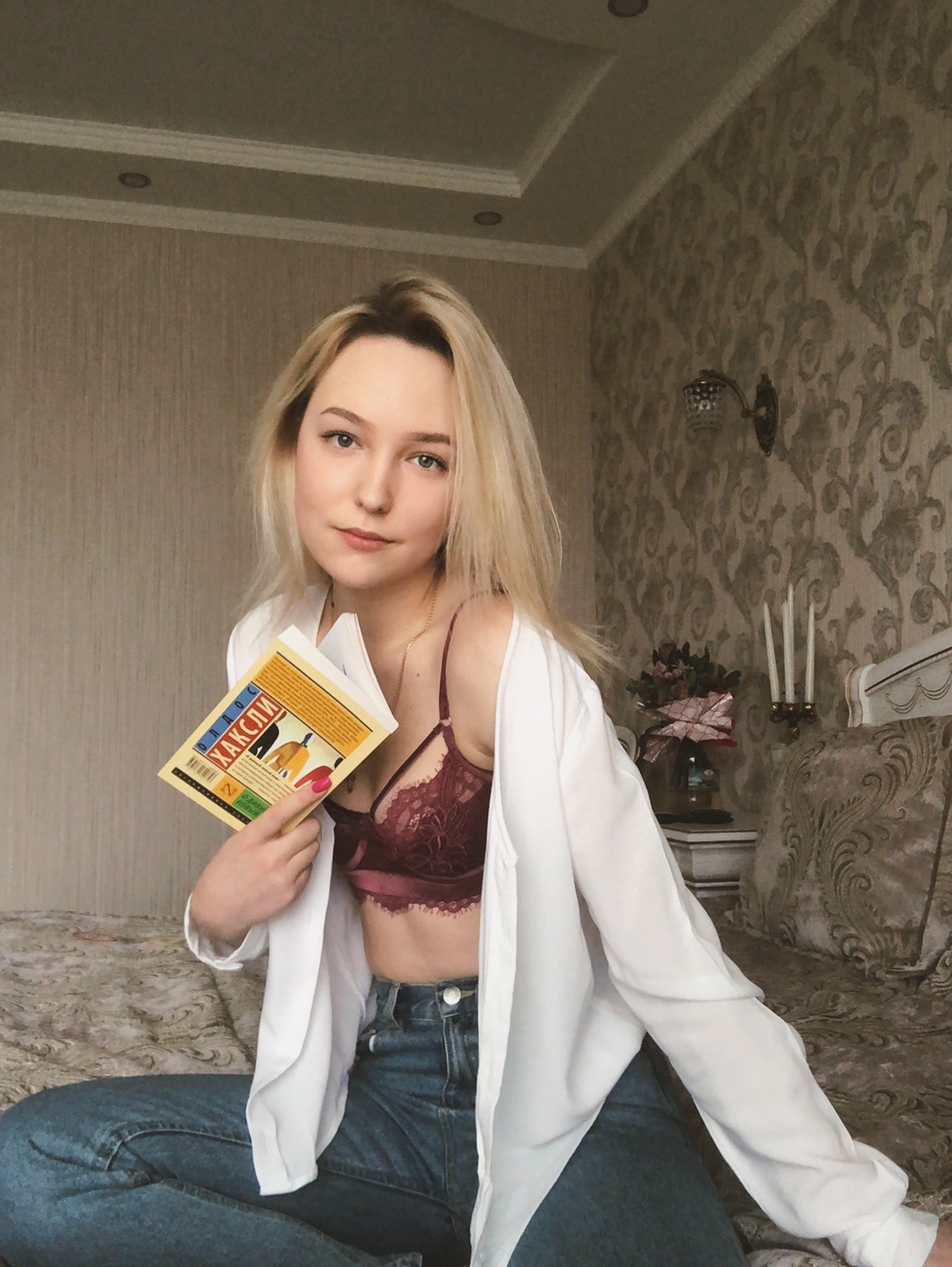 Смотришь, как она стягивает тонкую майку через голову — и вот уже голая спина, узкие плечи, никакого лифчика. Видишь, как ворочается на кровати, устраивается поудобнее, колени на покрывале. Трусики съезжают вниз по бёдрам — она их просто отбрасывает в сторону. Встаёт раком, прогибается, оглядывается через плечо. Это домашняя съёмка, комната обычная, свет из окна. Обнажённая попа поднята, между ног всё открыто — пальцы слегка раздвигают складки, показывает крупно, не торопится.