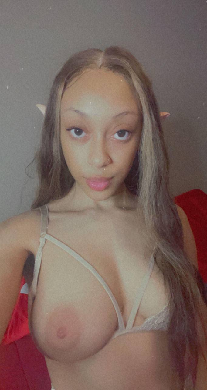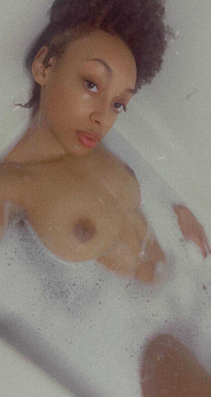 Смотришь, как она стягивает с плеч тонкие бретельки чёрного боди — медленно, будто нарочно растягивает момент. Тёмная кожа блестит в мягком свете, талия узкая, бёдра широкие — фигура, которую хочется рассматривать долго. Это любительские фото, снятые в небольшой комнате с белыми стенами — просто, без лишнего. Дальше боди падает на пол, и она остаётся голая, поворачивается спиной к камере, оглядывается через плечо. Финальные кадры — крупный план округлых ягодиц и длинных ног в чёрных носочках, которые она так и не сняла.