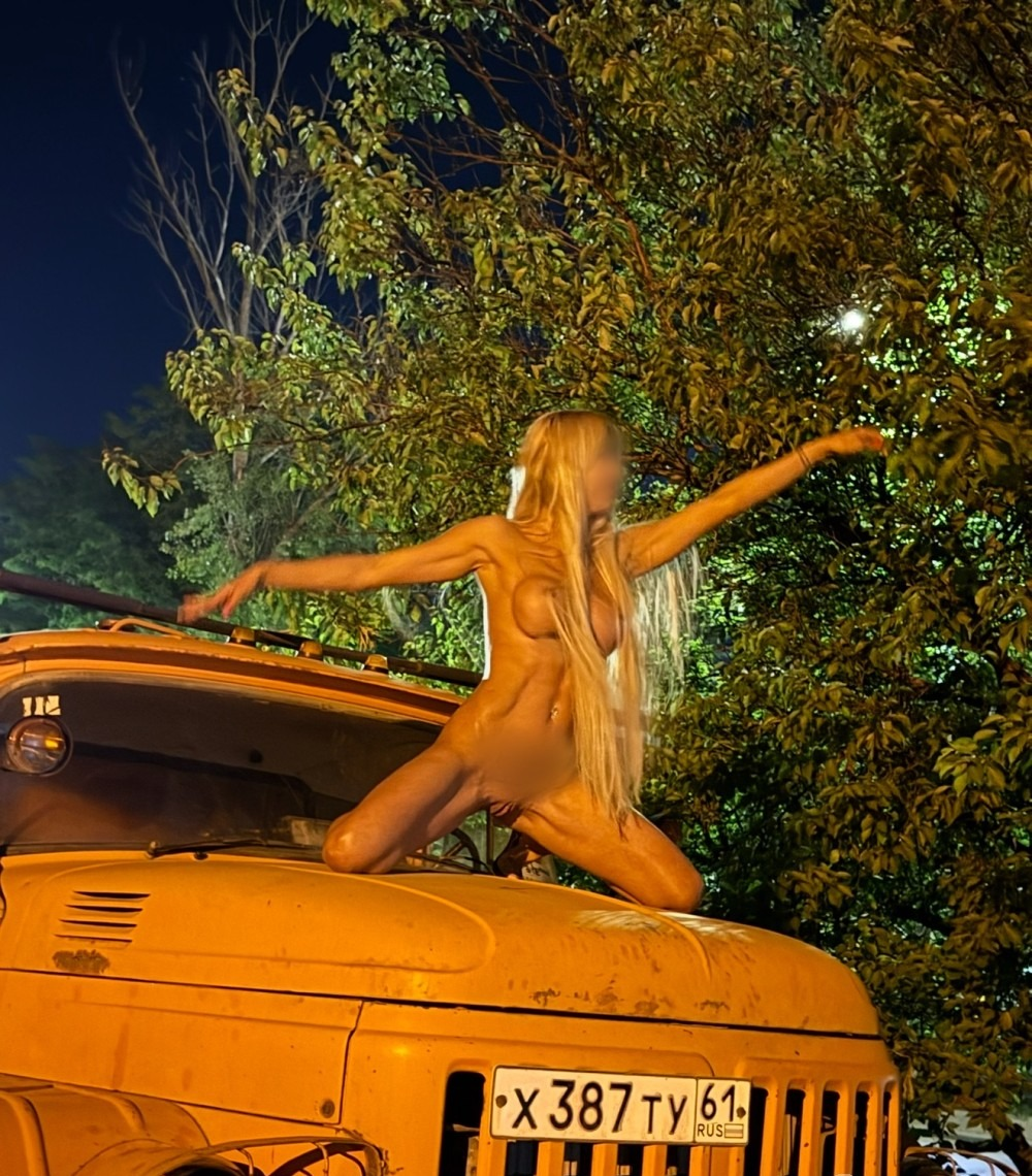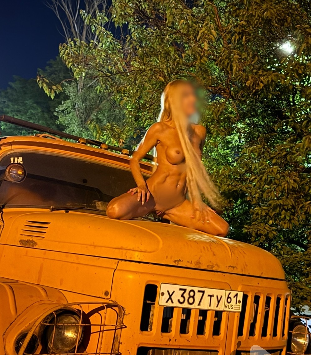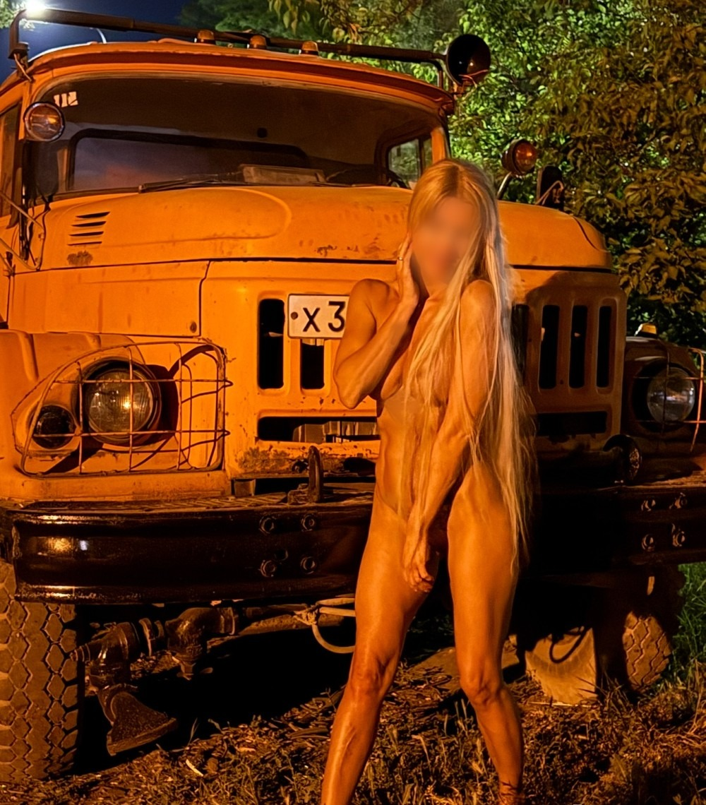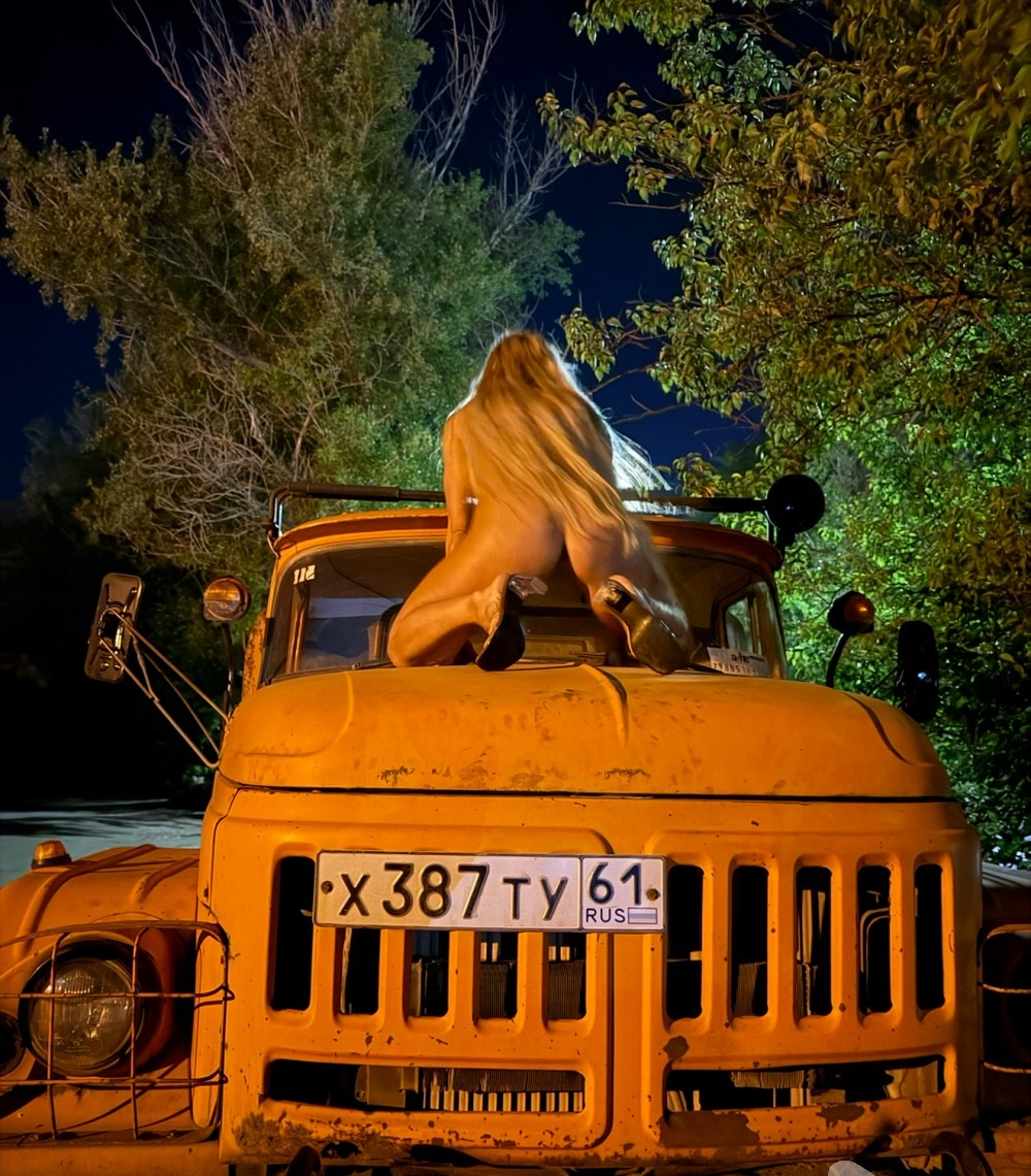 Ночью на стоянке я забралась на капот большого грузовика и сняла на телефон этот откровенный сет. Сначала стою в короткой джинсовой юбке и белом топе, потом медленно раздеваюсь — снимаю топ, расстёгиваю юбку. Показываю стройную фигуру в свете фар: плоский живот, длинные ноги. Стою голая на капоте, опираясь руками о лобовое стекло. Забираюсь на крышу кабины — домашнее фото в полный рост под ночным небом. Финальный кадр: сижу на краю крыши, ноги свешены вниз, руки за спиной.