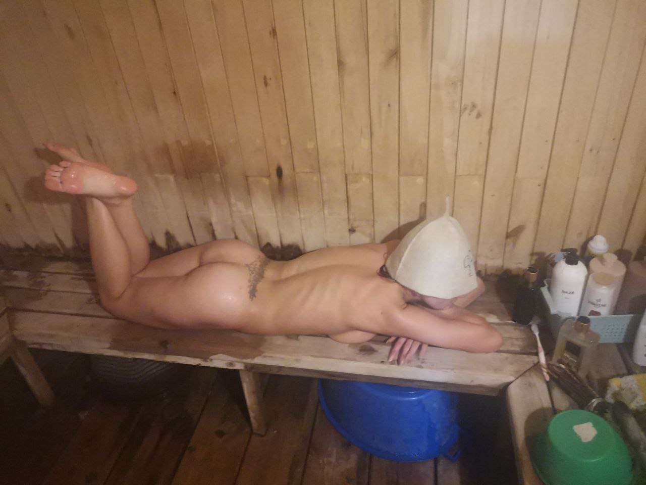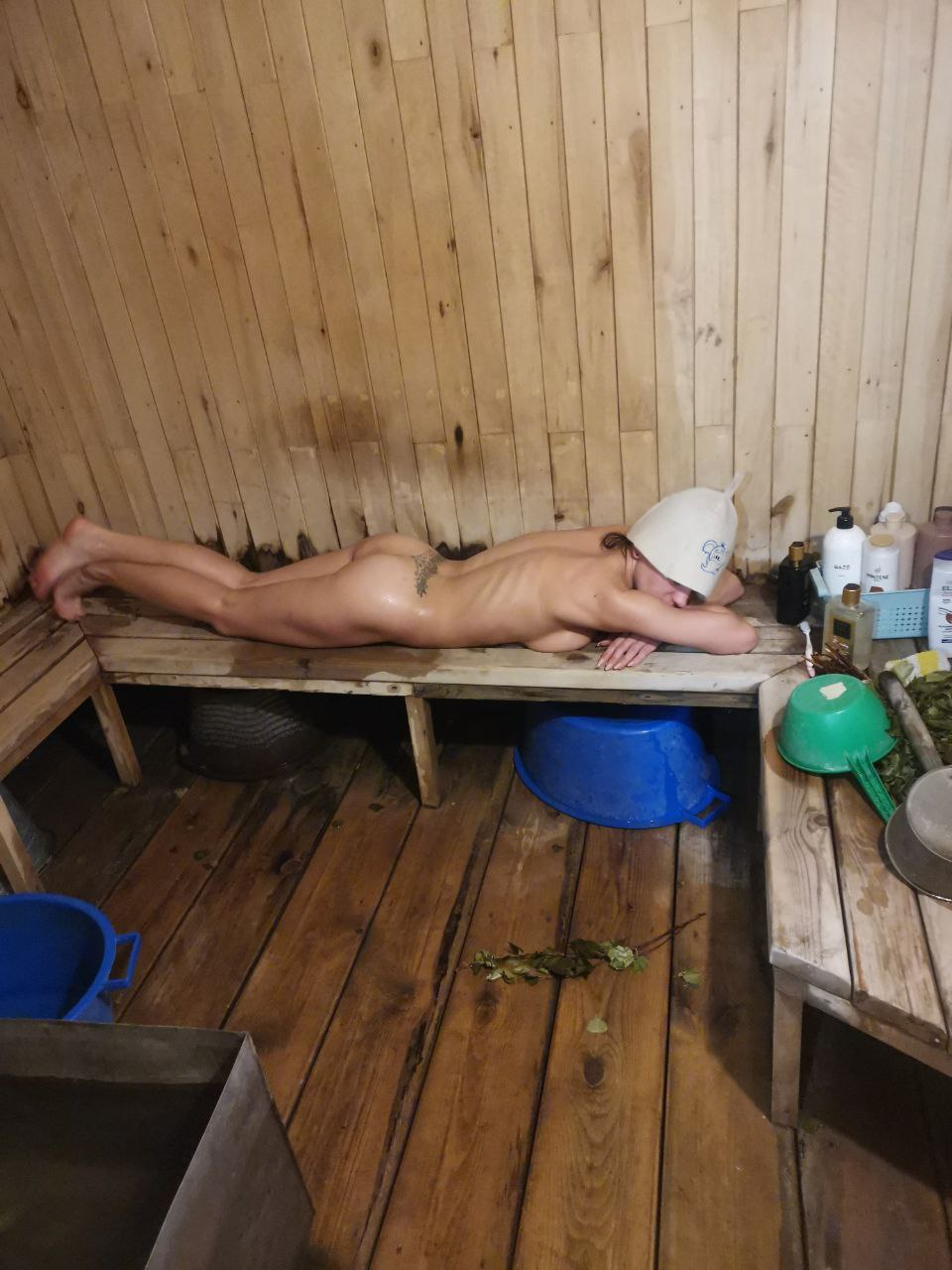 Домашняя съёмка в деревенской бане. Молодая замужняя женщина полностью обнажена — никакой одежды, только деревянные полки и пар вокруг. Она садится на нижнюю полку, широко раздвигает колени и смотрит прямо в камеру. Влажные волосы прилипают к плечам, кожа розовеет от жара. Женщина медленно проводит пальцами по внутренней стороне бедра, затем касается своей киски и слегка раздвигает губки. Камера фиксирует крупный план — блестящие от возбуждения пальцы и раскрытая промежность между разведёнными ногами.