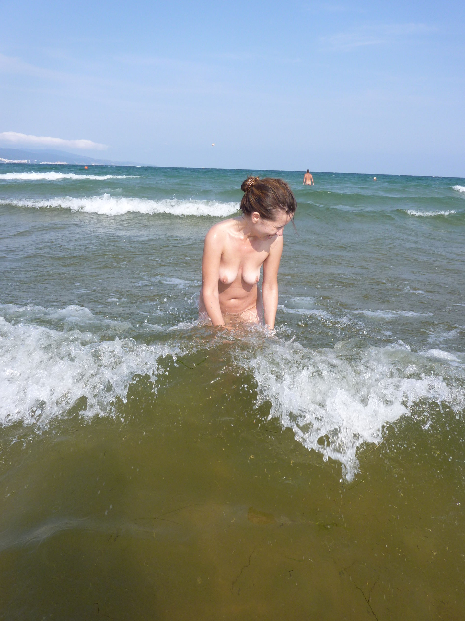 Частное фото с моря — жена отчитывается перед мужем о том, как проводит время без него. Снимки сделаны прямо на пляже: сначала она стоит у воды в купальнике, потом верхняя часть уходит, нижняя следом. Солнце, песок, волны на заднем плане. Она поворачивается спиной, потом снова лицом к камере — полностью голая, море за спиной. Последний кадр: она сидит на песке, вода касается ног.
