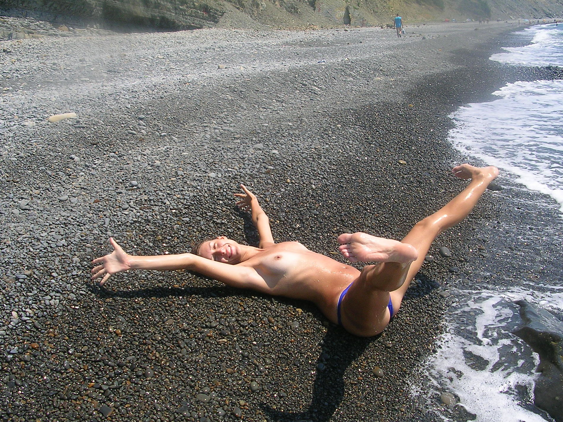 Молодая жена с упругой налитой грудью сняла топ на пляже