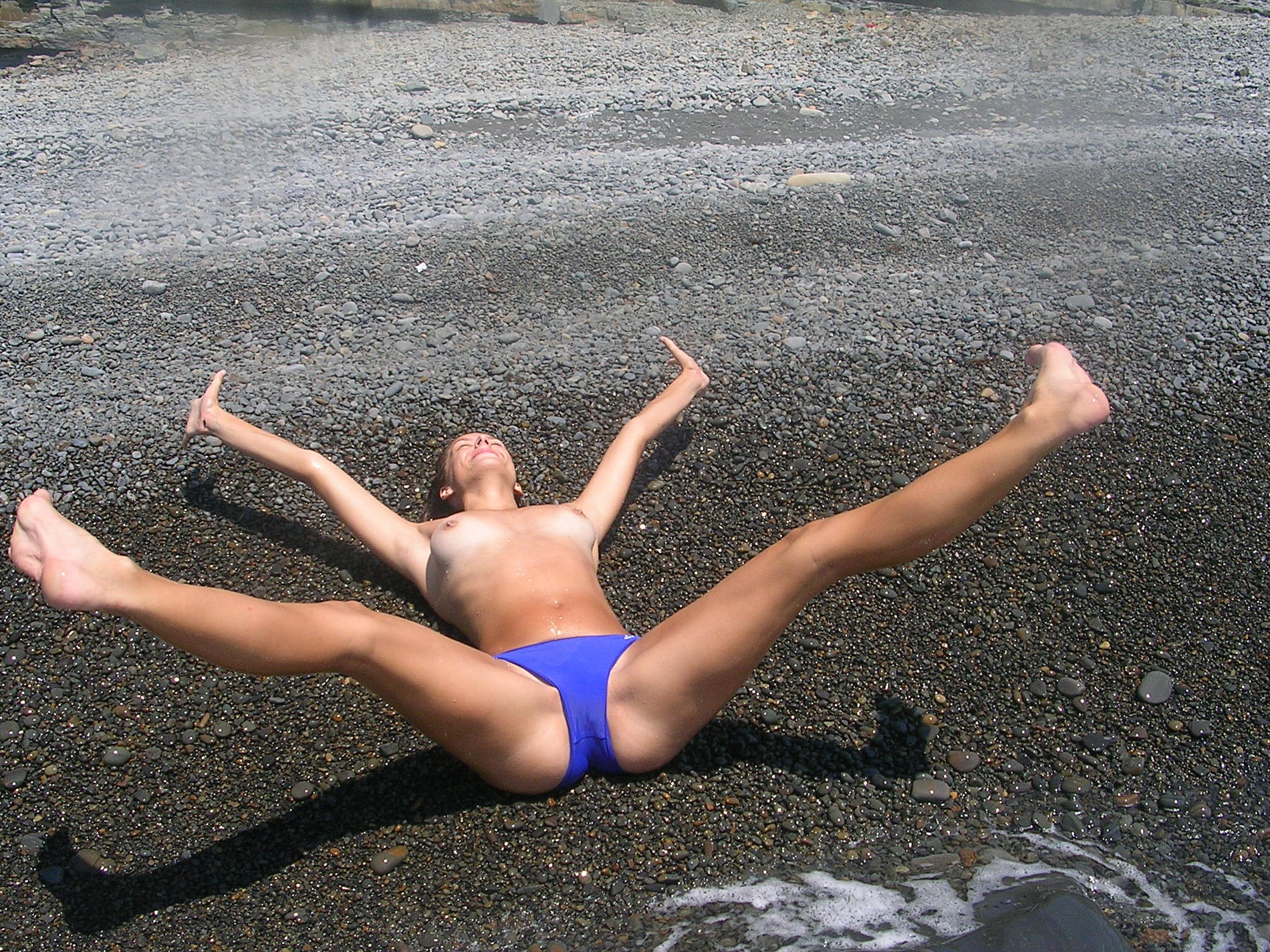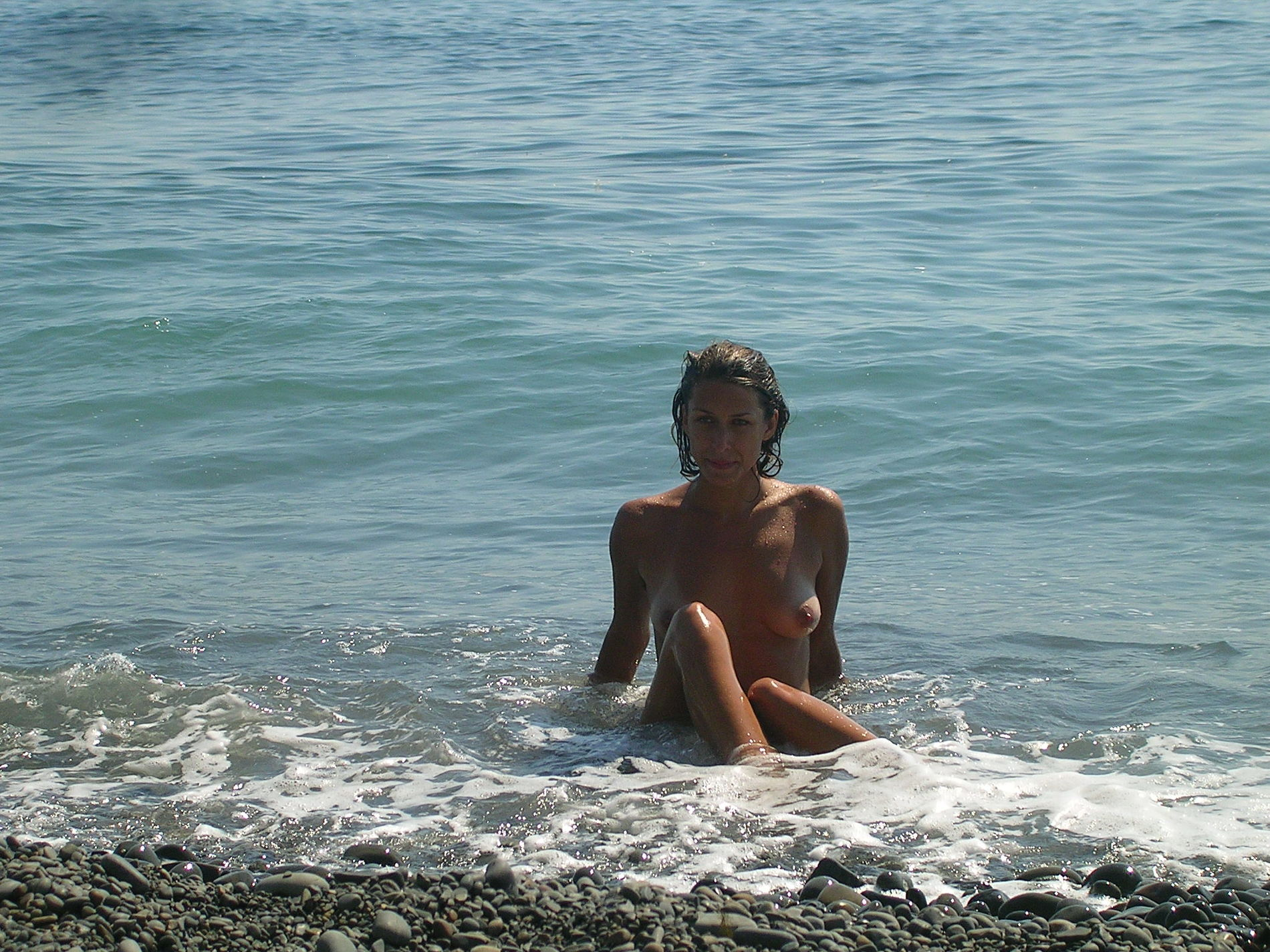 Пляж, открытое небо и молодая жена, которая решила оставить верх купальника в сумке. Любительские фото сделаны прямо у воды — видно песок, горизонт и солнечный свет, который падает спереди. Она позирует без спешки: стоит лицом к камере, потом разворачивается вполоборота. Грудь налитая, тяжёлая — держит форму даже без поддержки. Несколько кадров крупным планом, снятых с уровня пояса: грудь в фокусе, за ней — размытая линия моря.